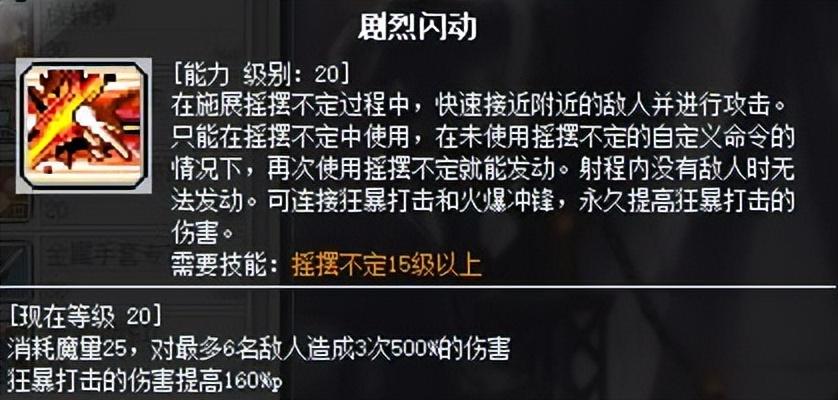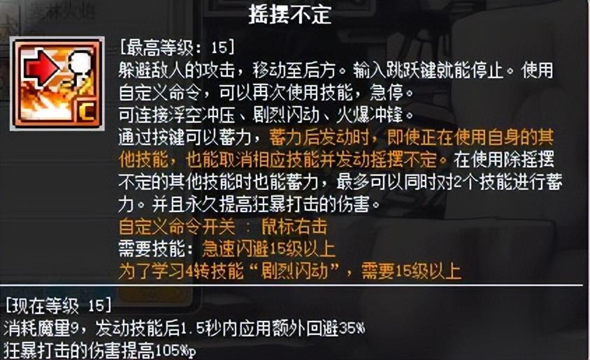另外摇摆不定在蓄力后可通过再次点击取消后摇并释放剧烈闪动(四转),且只能在面前大概4、5个身位有怪的时候释放,如果在最大距离处有怪,会直接冲刺到怪的面前。