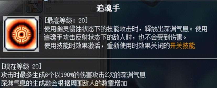 开关技能,每次上线或者复活记得打开,这个技能在幽灵模式下生效,使用幽灵技能时会释放出深渊气息自动攻击敌人。
