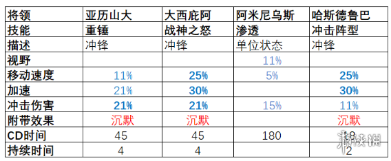 哈斯德鲁巴的冲击阵型相对较弱,但冲锋速度快,提升25%的移动速度,具备30%的加速,但冲锋伤害只有11%;虽然能力较弱,但CD时间只有18秒,是其它将领的一半。