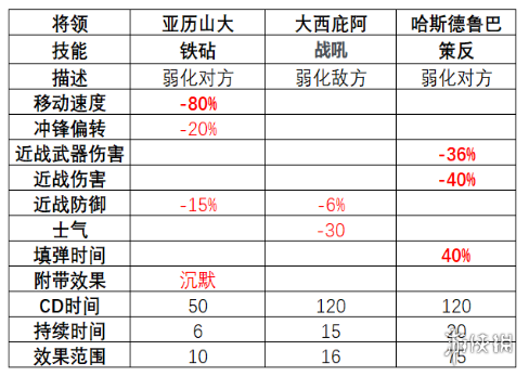 哈斯德鲁巴的策反技能,造成对方近战武器伤害降低36%,近战伤害-40%,装填时间增加40,关键是有75的使用距离,能有效削弱对方。