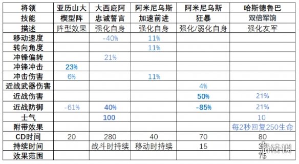 哈斯德鲁巴的双倍军饷能强化目标友军,近战伤害、近战防御提升21%,士气提升11,并带有每2秒回复250生命的效果。不清楚能否作用于自身,是比较好的辅助技能。