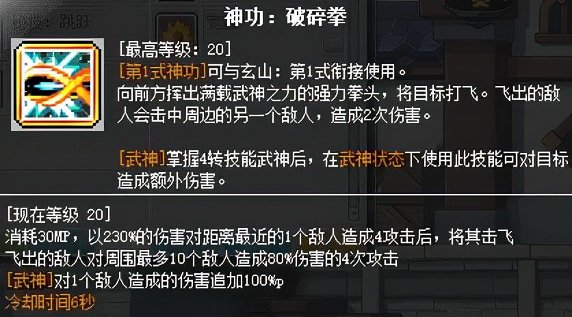 破碎拳在五转之后,因为其cd较短,最大的功效是空放维持武神状态;如果面板够高,爆炸伤害可以秒怪的话,那也可以用于提高刷怪效率。
