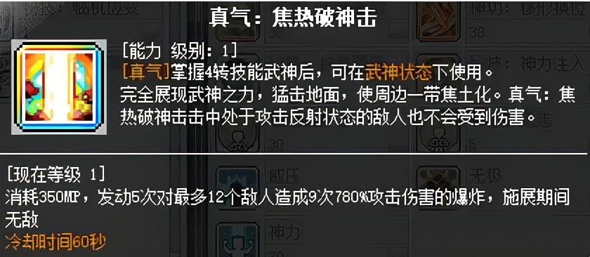 焦热破神击是集伤害与短无敌于一身的技能,虽然技能说明最多攻击12个敌人,但是有5次,是可以分开计算的,完全可以做到清屏。同时45段的780%伤害还具有五转核心可以加成,算得上是一个小的爆发技能;再加上有短暂的无敌时间,可以说是一个神技。遗憾的是,这个技能没有办法使用内在的消除重置cd,但是吃超越符文的cd缩减。