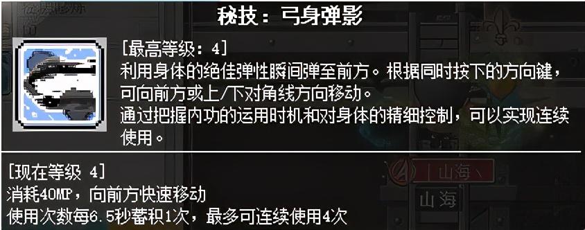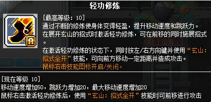 轻功修炼是墨玄高机动性的核心。在使用玄山基本招式的时候,可以配合方向键向对应方向移动,不论是在刷图还是打boss上都是调整位置的神技。同时这个技能是一个开关技能,在有些情况下,过于灵活的位移反而可能带来危险,这时就可以关闭该技能。