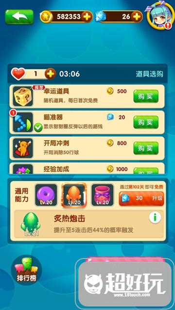 然后升级技能也很重要,技能前20级升级使用金币,21级之后是需要钻石。加分的技能可以升级到21,另外的技能20级就够了。技能20级需要达到10连击就有几率触发爆破,21级是5连击就能触发。在极限挑战中触发爆破也是提升分数很好的途径,爆破可以快速清除掉那些难以消除的巧克力圈、冰圈等障碍物。