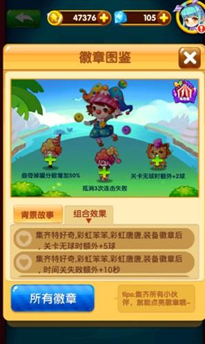 集齐角色特好奇和宠物彩虹笨笨、彩虹唐唐、笨小狮,可以点亮马戏团徽章。佩戴该徽章后,便可获得关卡无球时额外+5球、时间关失败额外+10秒、罐子分数+40%三大功能,简直就是游戏中的得分神器和紧急救命药。由此可见,特好奇在游戏中是一个多么神奇的存在,简直就是为三星评分量身而打造的一个角色,绝对值得入手一试!
