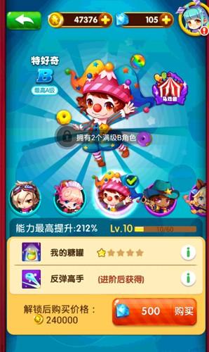 特好奇的初始品级为B,通过升级和进阶可以使品级提高至A(最高),拥有我的糖罐和反弹高手两个技能。我的糖罐技能可以大量的提升罐子得分,是获得3星评价的必备技能;进阶后可获得反弹高手技能,该技能一旦拥有,便可永久激活反弹线。除此之外,特好奇的能力最高可提升至211%,所以只要拥有该人物,就可以满足游戏的中后期需求。