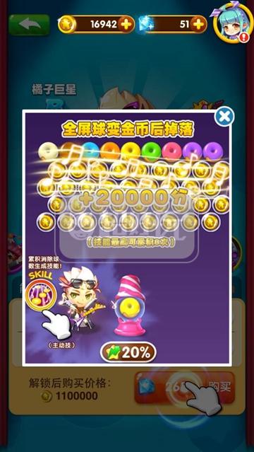 黄金魔音:刷金币神技啊,技能效果使得全屏球变为金币球后掉落。可见橘子巨星很适合上金币模式来收集大量的金币啊!