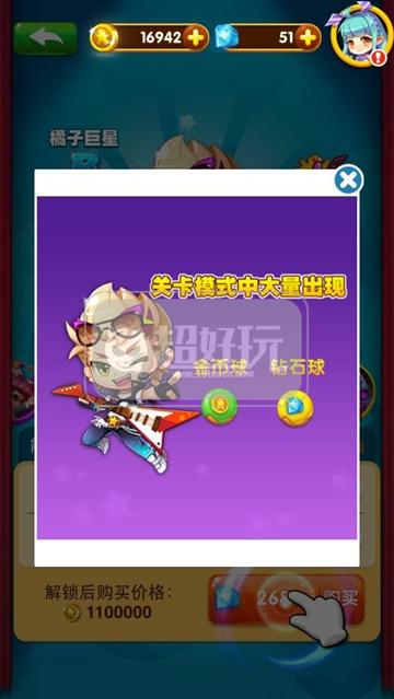 在冒险模式中通关第60关就可以解锁橘子巨星,然后就能用金币购买了,需要金币1100000,或者没通关60关的可以使用2688钻石购买得到。