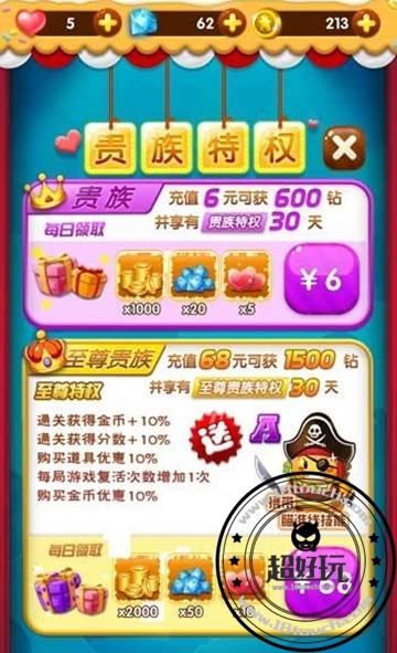 至尊贵族则需要充值68元,即刻能获得1500钻石,也是能享受30天的至尊贵族特权,分别是每天通关获得金币+10%、得分+10%、买道具优惠10%、金币购买优惠10%、每局游戏复活次数+1、每日能领取2000金币、50钻石以及10颗爱心。