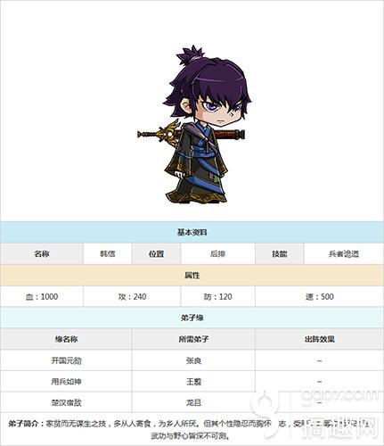 弟子缘分:目前韩信是5个缘分的人物,2个血缘,2个攻击缘分,一个血缘。真可谓是攻守兼备,作为后排强力输出的同时,又能通过强大的血缘保证自己的血量,不被AOE被带走。
