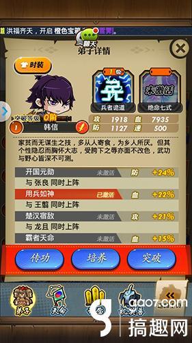 培养:韩信自身成长还算OK,由于缘分的原因,身板比较肉,所以全血培养就可以了。