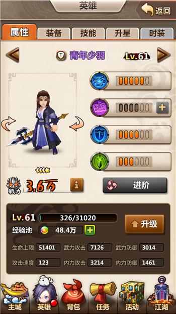 对于青年少羽的第三个技能来说,该技能就是加防御又加武力,加的还特别高,双防一加,后排治疗持续在给他加上,一夫当关万夫莫开,而且特效还好看!