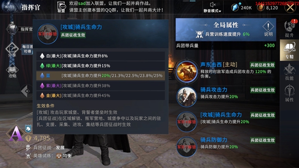 专精:指挥官军阶达到2阶、4阶、7阶时,可解锁指挥官专精。指挥官专精是针对兵团征战,比如野外采集、攻城、征伐叛军等军事行动。可提升兵团的作战/采集实力。