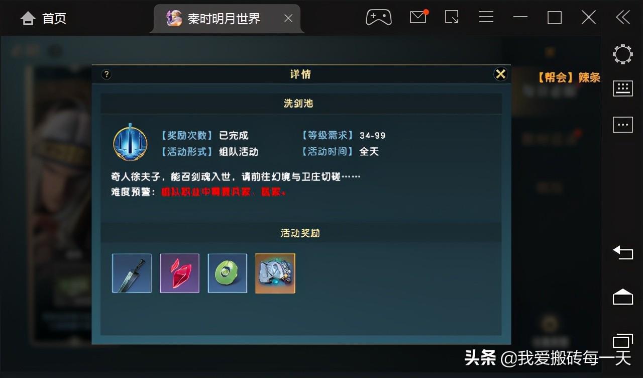 昨天到32的号,今天跑下天罗地网加游侠赏金到34级,就可以开启今天新的日常,洗剑池。