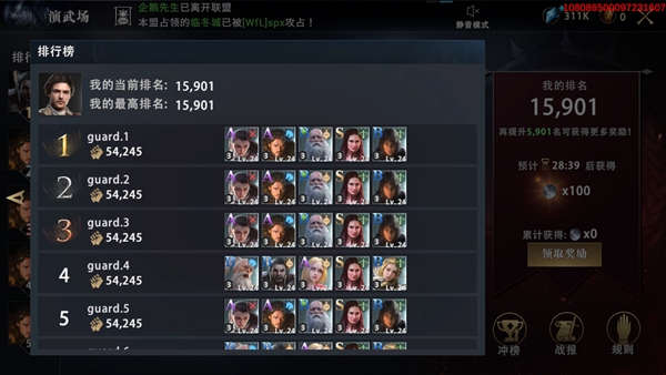 排名信息:排名信息板块涵盖了领主当前在演武场的排名,以及当前排名可领取的联盟币奖励。