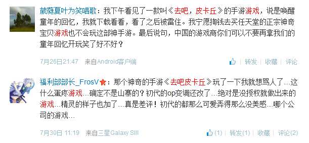 去皮吧创建之后,百度为它提供了特权,去皮吧的内容不仅在口吧伪装主题,更被强制置顶。原以为这样的“精准推广”能够吸引《精灵宝可梦》的玩家来玩《去吧皮卡丘》,但效果恰恰相反。愤怒的口吧玩家进入去皮吧,一方面声讨百度,要求取消去皮吧在口吧的强制置顶;另一方面,又对着《去吧皮卡丘》的玩家声讨本作的版权问题。所谓“支持原作版权”,在去皮吧看来是另一种“卖国”:“我们为什么不能支持一下国产游戏,为什么要买游戏机和正版游戏,给日本公司送钱?”“我们普通玩家接触这款游戏只是为了怀旧。我们并不会过多在意他的版权问题。”我不知道这款游戏是正版还是盗版,但是只要让我们玩家玩的开心就可以了。”