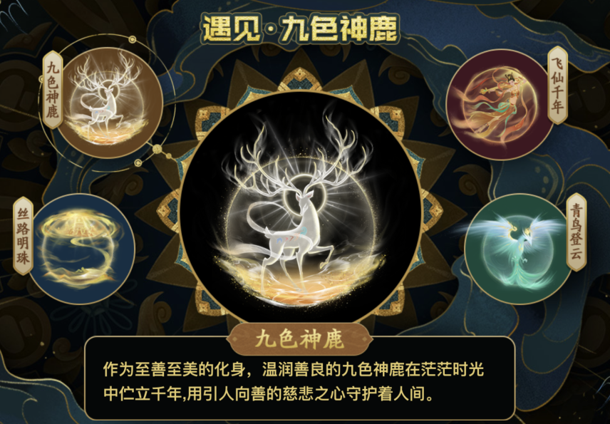 1、在皮肤上做创意:《球球大作战》的皮肤是游戏中具有较高创作自由空间的元素,这次敦煌联动版本就推出了4款联动皮肤,分别对应敦煌文化最知名的几个标签——九色鹿、飞天壁画、丝绸之路以及青鸟,具体形象风格上偏向淡雅,更贴合年轻人喜欢的美感。此前,两个限定皮肤青狮和金虎(敦煌文化中的瑞兽形象)则设计得比较喜庆可爱,更具有新年感。这些皮肤早在版本爆料期就引爆了玩家期待,从而达成对敦煌版本的第一波助推。