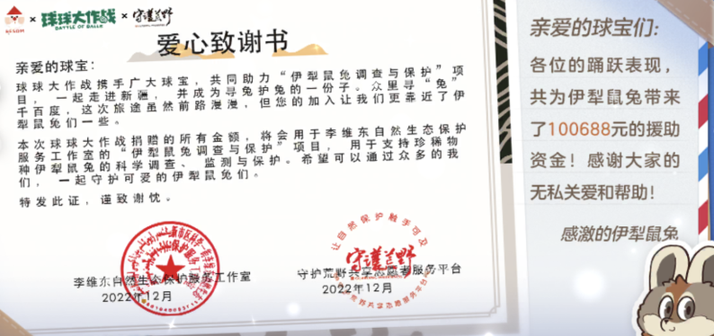 另一方面,《球球大作战》与中国志愿服务基金会、“守护荒野”平台合作打造了科普互动玩法,以伊犁鼠兔为核心,主要针对新疆荒原山区野生动物的物种特征、生活习性和生态保护设计答题活动。玩家答对题目的数量,还会按照比例兑换成捐赠金额用于援助伊犁鼠兔的调查、监测和保护。根据《球球大作战》此前在游戏内公布的数据,最终筹集了100688元善款。