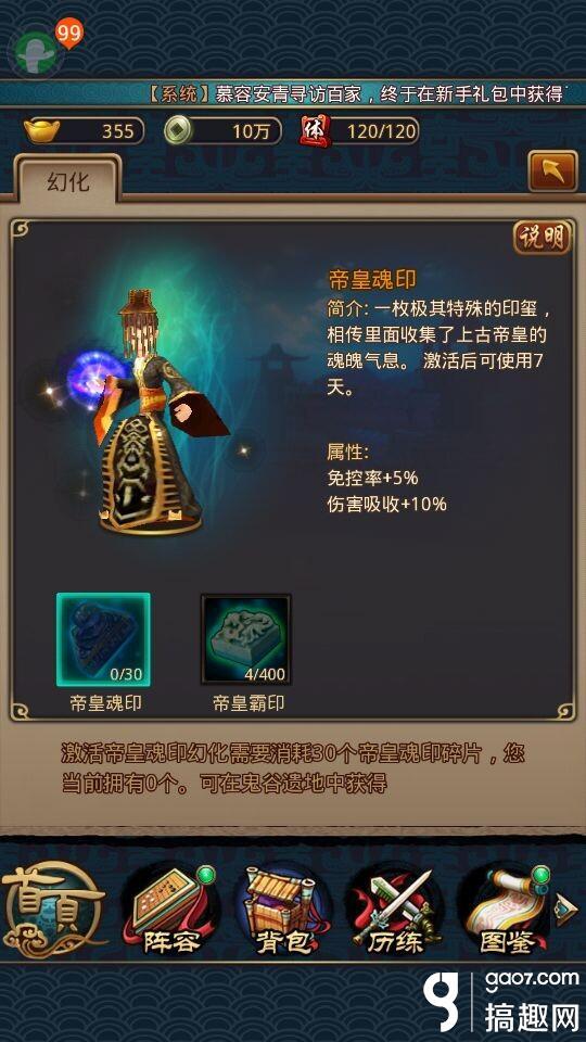 通过上面,我们可以了解到,秦始皇幻化需要集齐30个帝皇魂印,就能激活相关属性。