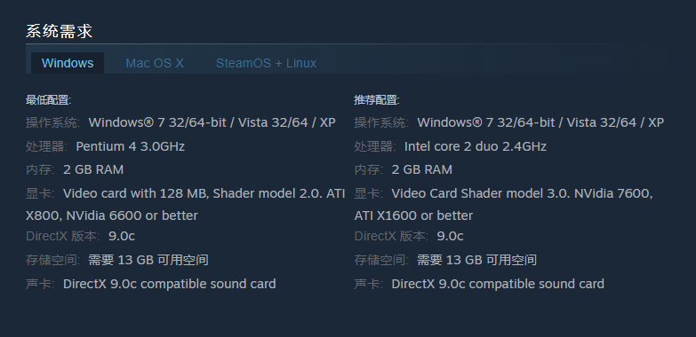 配置方面,求生之路2需要intel Core2/NVIDIA 7600以上级别硬件,需要2GB内存,13GB可用存储空间,喜欢第一人称射击丧尸类游戏玩家不妨到steam平台下载试玩。
