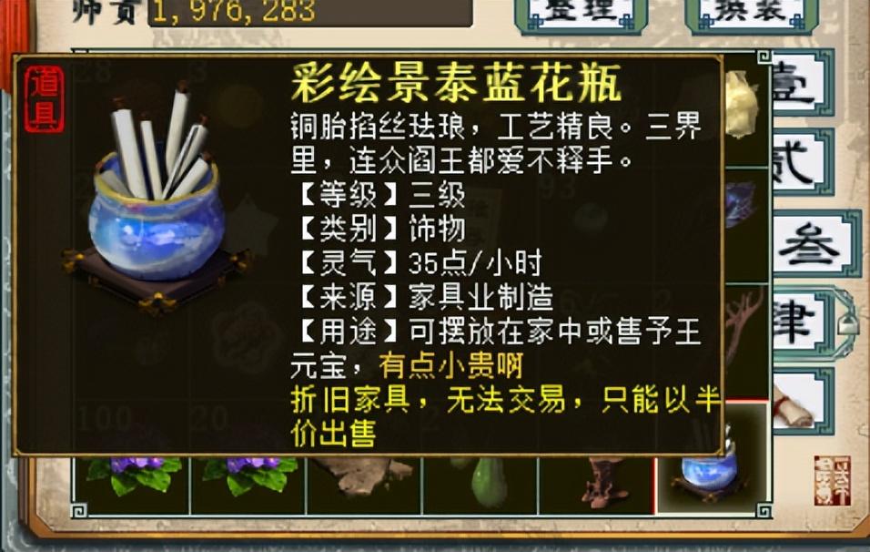 除了其他家具可以摆放5个外,饰物家具最大摆放数同样是5,那么饰物家具改如何选择呢?根雕冻石盆景,每个每小时回灵22点,而景泰蓝花瓶,每个每小时回灵35点,5个根雕盆景,每小时回灵110点,而景泰蓝花瓶,5个每小时回灵可以达到175,如果选择根雕盆景的话,余下的家具3个桌案、4个座椅、3个灯炉、2个床榻,需要去分担225点的灵力回复,而选择景泰蓝花瓶,其他部位家具要分担的回灵少一些,只是景泰蓝花瓶的价格高一些。