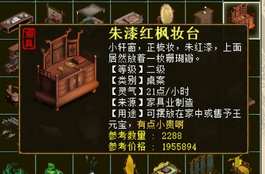 对应的3个桌案,大家会选择什么呢?一心建议大家选择朱漆红枫妆台,3个桌案,每小时回灵可以达到63点,如果现有的家具需要解决225点每小时灵力回复,那么去掉桌案解决的63点,其余的162点灵力,分摊在3个灯炉、2个床榻和4把椅子上,平均每件家具需要解决18点回灵。