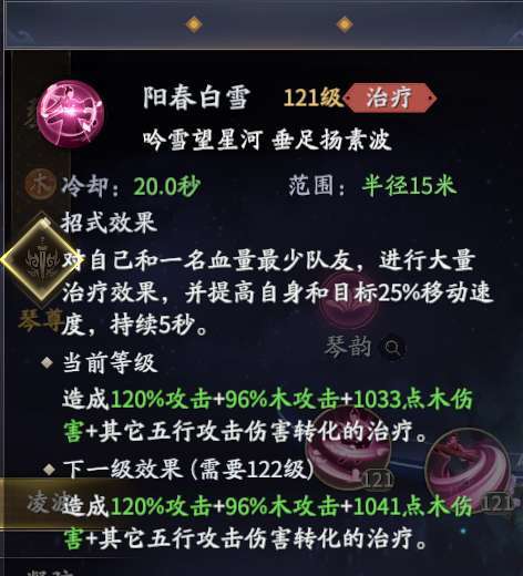 拉扯琴必备霓裳羽衣,更老六一点带阳春白雪,前三个技能打输出,后两个技能拉扯+回血