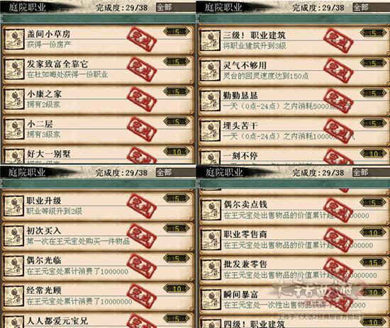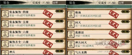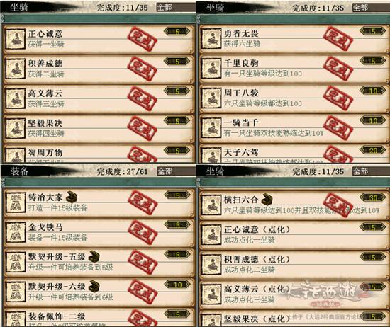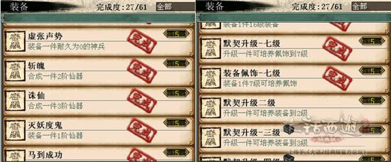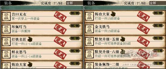 2)装备。打造装备,穿戴都有功绩,没事可以练练作坊。一般玩家培养了配饰的话这些功绩也都能拿到手,至于2-6整套配饰,装备仙器神兵之类的话可以考虑在其他玩家手里租借来完成。用一级垃圾配饰来培养的话是不需要消耗师门和金钱的。没事可以自己培养几件,日常获得的一级配饰加以利用。酒囊饭袋那个功绩可以买新手装备穿着刷野外战斗来搞一下。