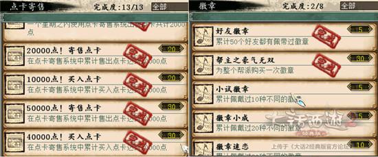 3)点卡寄售、徽章。点卡寄售这个这么说?没事卖卖点卡,自己再买买别人的点卡,有寄售积分可以抽取奖励,还能完成功绩何乐不为?徽章这个帮主之豪气无双,这个可以找个一个人的帮派自己买一个,30点功绩,游戏里应该有人卖这个功绩吧。