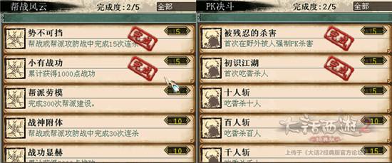 3)帮派风云、PK决斗。组队帮派这个必做,花费时间少,还能得到召唤兽亲密,帮派成就。这个随意吧,看个人意愿。我是不喜欢PVP。