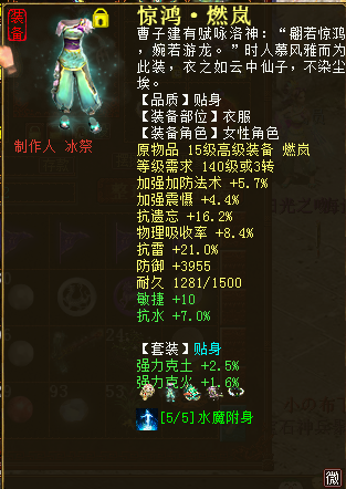 哦,对了,再说一句,惊鸿套装打上以后是没办法再打提抗的,所以,魔族可以用5件惊鸿搭配3件通天,通天3件是增加强吸的。