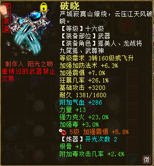 这把武器我是在洛阳集市买到的,强吸7,自己炼化的克火23,武器700买到的,羞愧的是,我这人比较懒,够用就行,开光也没开,炼器也随便对付了一下应付了事,不过新宝石玩法的出现就完美的弥补了一些不足。