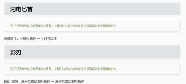 如果你是射手玩家,那么一定要知道S30赛季闪电匕首和影刃这两件装备被削弱了。闪电匕首的装备属性从+40%攻速改为了+35%攻速,影刃被动-暴风,暴击后增加25%攻速改为了暴击后增加20%攻速,后羿在出装的时候可以适当衡量一下了。