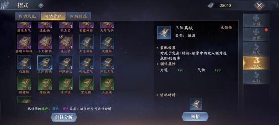 另外,建议可以搭配选择《三阳真诀》对定身/封招/眩晕敌人伤害增加8%,非常适合棍控制多,防御足之一特点。