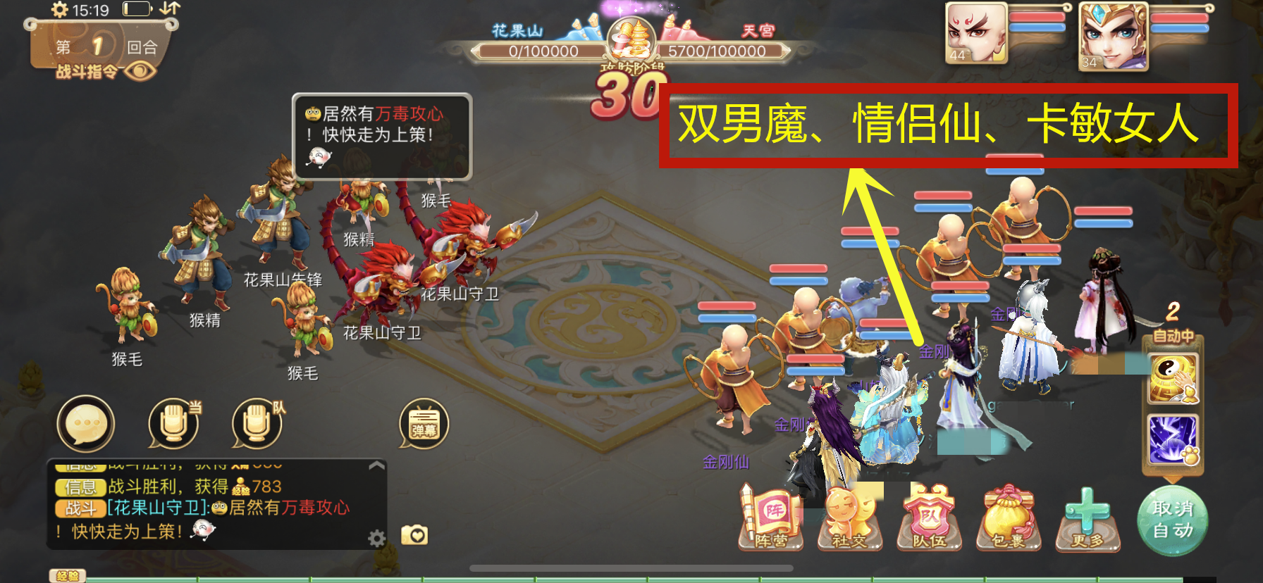 山妖继续使用,另一个仙族带法马面,其余三个单位继续带金刚仙,改成全敏。如果喜欢的话,换个龙马耍耍也不错。