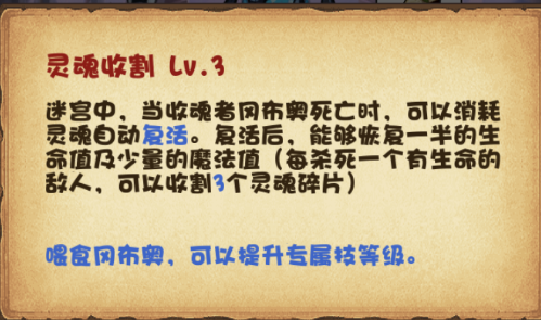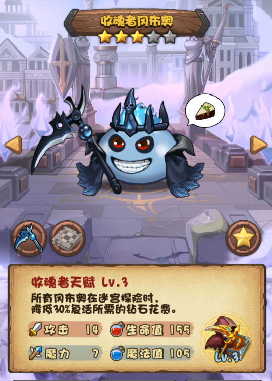 它的专属技能是灵魂收割,理论上可以免费复活无限次,想想都有点小激动呢#(PS:这货一星就够了,一星就够了,一星就够了,重要的事情发三遍,不要像楼主傻傻的升到3星然后晾着。