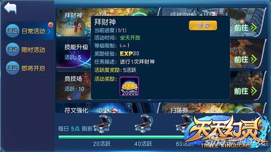 想要快速升级,每天都要记得拜一次财神,使用10钻石兑换一次金币。在游戏中,每天第一次拜财神,除却可获得5000金币外,还可以获得30经验值和20000金币的日常活动奖励。也就是说,只要使用10钻石,就能收获大量的经验值和金币,十分合算。