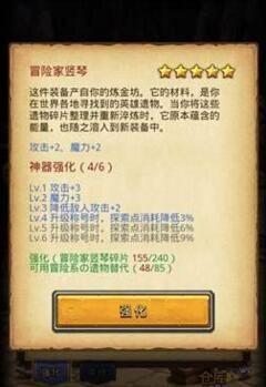 强化神器。前期神器可以提供相当客观的属性加成,适当强化是必要的。推荐强化黑暗仲裁官手套至到+3,随后就不要强化其他神器了,攒钱强化冒险者竖琴。除了特殊的活动本外,其他副本基本不用考虑除竖琴外的神器。竖琴强化到+6大约需要160万金币。