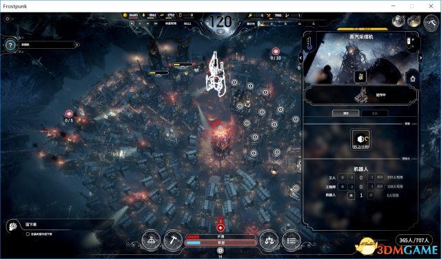 后期有14个机器人,2个在高级煤矿,5个在蒸汽采煤机,2个在高级冰墙钻机,2个在高级制钢厂,2个在伙房,还有一个在打杂,煤矿崩塌之后把伙房、制钢厂和打杂的全拉去炭窑烧煤,每天煤炭还有盈余。