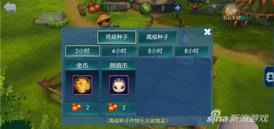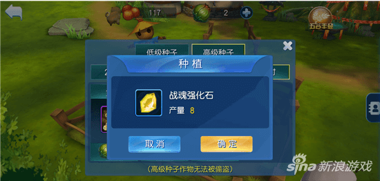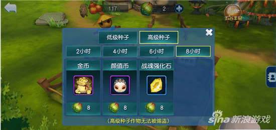 主公都知道,种菜玩法中有两种种子可供玩家选择!第一种是普通级种子,可以产出金币、颜值币,种子会随时间自动回复;第二种是高级种子,可以产出金币、颜值币、战魂石,高级种子需要花费钻石购买!其中每次种植,高级种子的道具产出多余普通级种子。