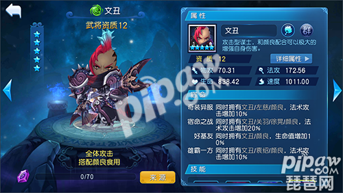 文丑在游戏里面变成了地下摇滚歌手,要是同时拥有文丑和颜良的话,文丑的 攻击力就会自动增加。当然了,知道官渡之战的玩家应该都明白,这个只是强调文丑和颜良可以一起用,并不会对战斗造成什么实质性的改变。而且文丑也是蓝色五星,蓝色五星必有群体攻击,文丑也是能够进行群体攻击的。所以,想要玩群攻的可以考虑带上文丑,但是要记得同时也要带上颜良哦,不然文丑脆皮很快就会被对方削掉。