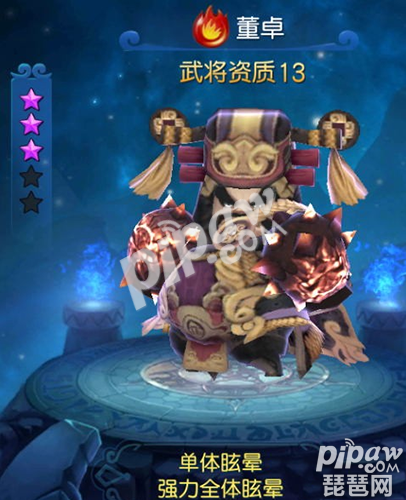 董卓这个角色属于第二个大BOSS。承接的是张角。在十六章的时候就能够刷出信物来。当然,因为出现的比较靠后,能力肯定就会比前期的武将要好用一些。董卓的能力主要是眩晕为主,不管是单体眩晕还是全体眩晕都能够在这个使用。因为有火烧京都的历史,所以属性也是属火。只是董卓因为信物在后面的关卡才掉落,对于升星的话,就会有点困难。而董卓的宿命是增加物理攻击和生命值,宿命属性有5个,获得的加成相对较多。目测后期表现相当不错。至于董卓好不好,这个就看个人了,要是队伍里没有火属性的,可以考虑带董卓,毕竟有相克设定存在,一个低火属性还是很有用的。