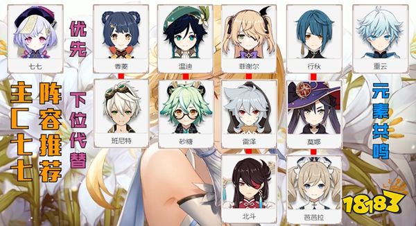 七七主C时,可带香菱,温迪,菲谢尔,行秋,也可带重云触发元素共鸣