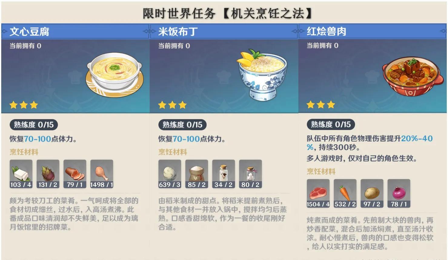 (【机关烹饪之法】为限时世界任务;【韶光抚月】为活动任务,因此不能确定以后还有没有其他获得这些食谱的机会,所以各位旅行者最好还是不要错过哦~)