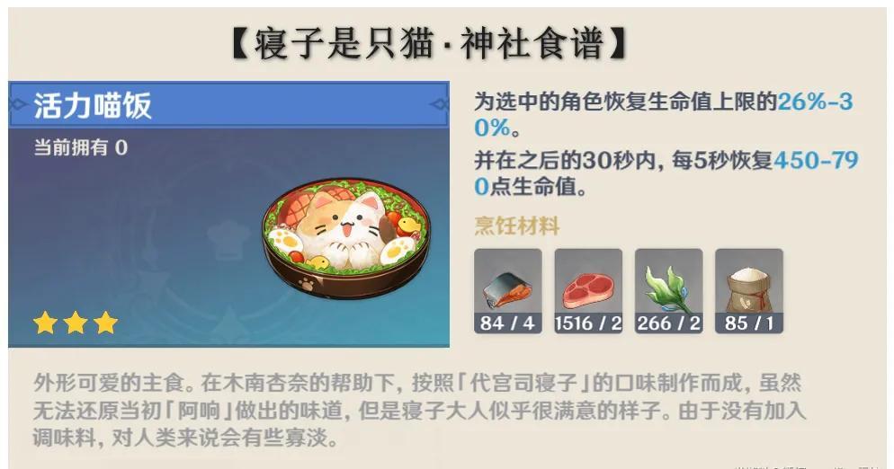 【寝子是只猫】为系列世界任务,和稻妻【踏鞴物语】一样需要分多天完成。其中活力喵饭所在的神社食谱这一任务是在第四天~