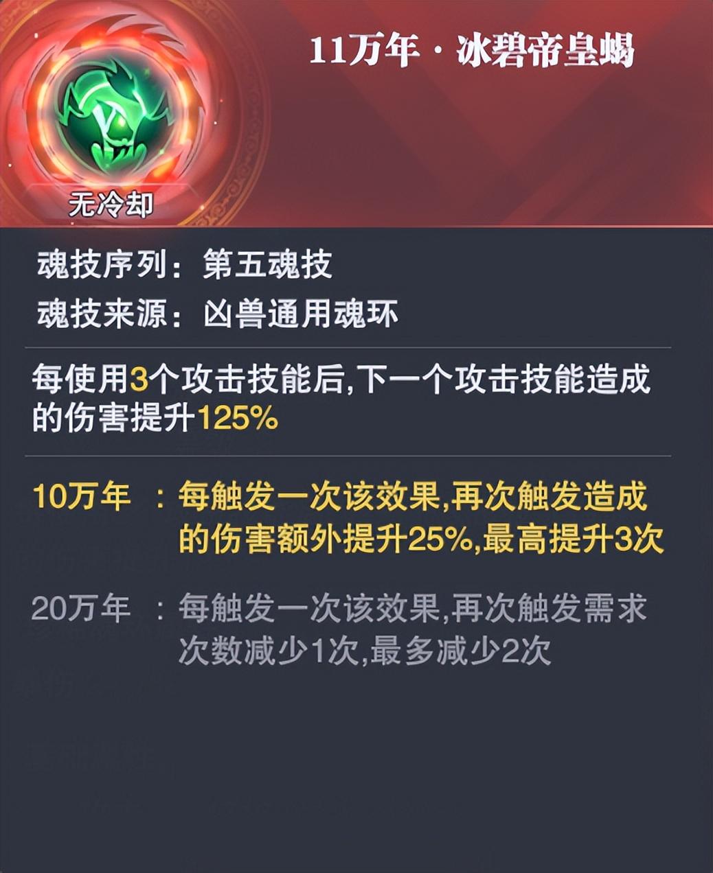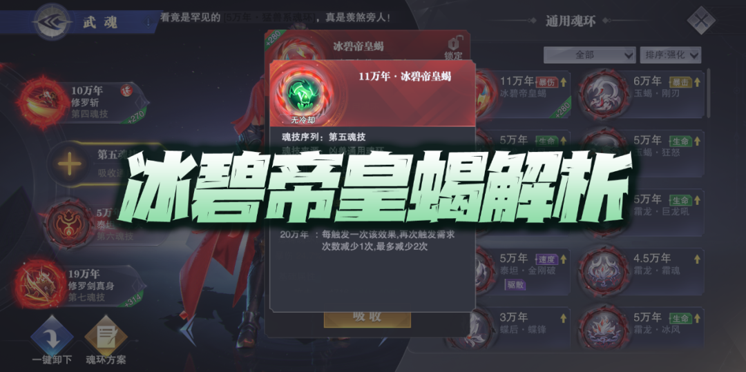 首先大家都知道【冰碧帝皇蝎】的魂环年限可以提升到20万年,所以对于部分大佬级别的玩家来说,冰碧魂环从属性上来讲就会领衔一般的通用一点点,但对于像是维一这类普通玩家来说,冰碧的年限我们也就不用多想了,能搞到10万年就已经是善莫大焉了,所以对年限大家也不要有太高的追求,躺平即可。