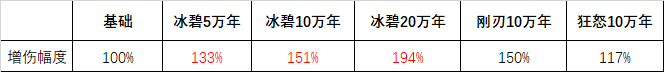 所以从上述的结果对比来看,虽然这个结果存在一定的理论性,不能完全契合到我们不同魂师在长图打伤害时的结果,但其也可以给我们一定的结论参考:就5万年的冰碧来说已经是可以达到还算不错的增伤幅度,而10万年的冰碧就已经可以说是完胜同年限的【刚刃】与【狂怒】了,毕竟我们也不能保证每场战斗都能触发【刚刃】的50%增伤不是么;而最后20万年的冰碧则堪称质变的效果。