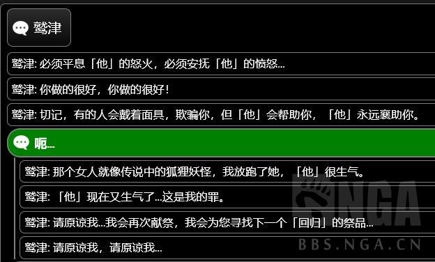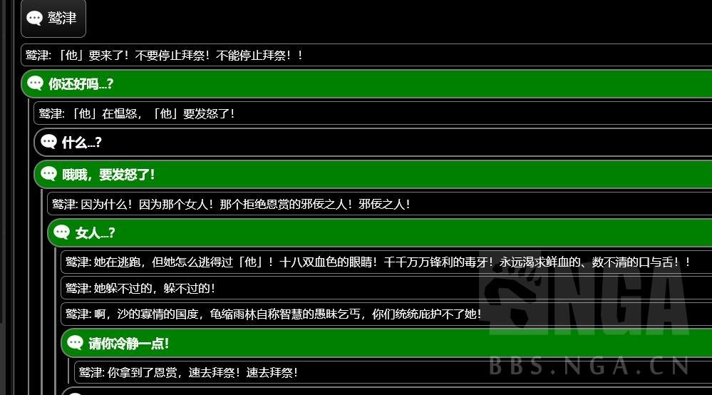 总之俨然变成了一种克苏鲁的画风,村长发生了什么呢?如果在蛇神之首,魔偶机兵附近可以找到一个奇怪的神龛和一个叫做鹫津的人,他会要求你每天拜祭三次,隔日这里会出现一个宝箱。连续祭拜数日之后,会提到这样一件事。(这里用内鬼网的对话数据展示,因为我已经做过了,没法截图)