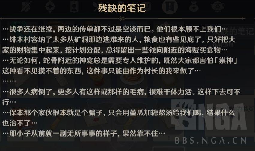 在数日坚持之后,我们会发现他没有再收走鸣草,猜测他可能出了什么事情,于是我们跟随元素视野(其实并不太好用,如果找不到的话可以搜索攻略查看具体位置)我们可以找到他留下的三个笔记: